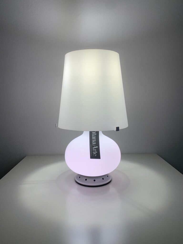 Lampada da tavolo con diffusore in tessuto.