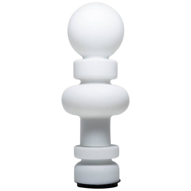 La lampada da tavolo Eva di OLUCE rappresenta una boule all’interno della quale è presente la sorgente a LED, aperta su un lato e appoggiata su una sottile base cilindrica.